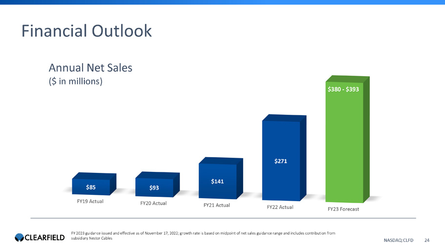 FY19 Actual FY20 Actual FY21 Actual FY22 Actual FY23 Forecast $85 $93 $141 $271 NASDAQ:CLFD FY 2023 guidance issued and effective as of November 17, 2022; growth rate is based on midpoint of net sales guidance range a nd includes contribution from subsidiary Nestor Cables Annual Net Sales ($ in millions) NASDAQ:CLFD 24 Financial Outlook $380 - $393