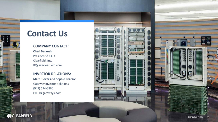 NASDAQ:CLFD 26 Contact Us COMPANY CONTACT: Cheri Beranek President & CEO Clearfield, Inc. IR@seeclearfield.com INVESTOR RELATIONS: Matt Glover and Sophie Pearson Gateway Investor Relations (949) 574 - 3860 CLFD@gatewayir.com