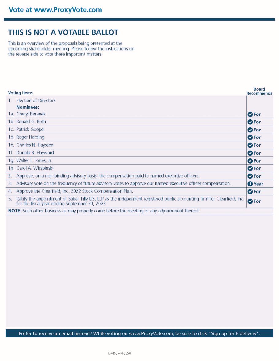 Vote at www.ProxyVote.com THIS IS NOT A VOTABLE BALLOT This is an overview of the proposals being presented at the upcoming shareholder meeting. Please follow the instructions on the reverse side to vote these important matters. Prefer to receive an email instead? While voting on www.ProxyVote.com, be sure to click “Sign up for E - delivery”. Voting Items Board Recommends D94557 - P83590 1. Election of Directors Nominees: 1a. Cheryl Beranek For 1b. Ronald G. Roth For 1c. Patrick Goepel For 1d. Roger Harding For 1e. Charles N. Hayssen For 1f. Donald R. Hayward For 1g. Walter L. Jones, Jr. For 1h. Carol A. Wirsbinski For 2. Approve, on a non - binding advisory basis, the compensation paid to named executive officers. For 3. Advisory vote on the frequency of future advisory votes to approve our named executive officer compensation. 1 Year 4. Approve the Clearfield, Inc. 2022 Stock Compensation Plan. For 5. Ratify the appointment of Baker Tilly US, LLP as the independent registered public accounting firm for Clearfield, Inc. for the fiscal year ending September 30, 2023. For NOTE: Such other business as may properly come before the meeting or any adjournment thereof.