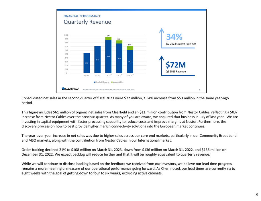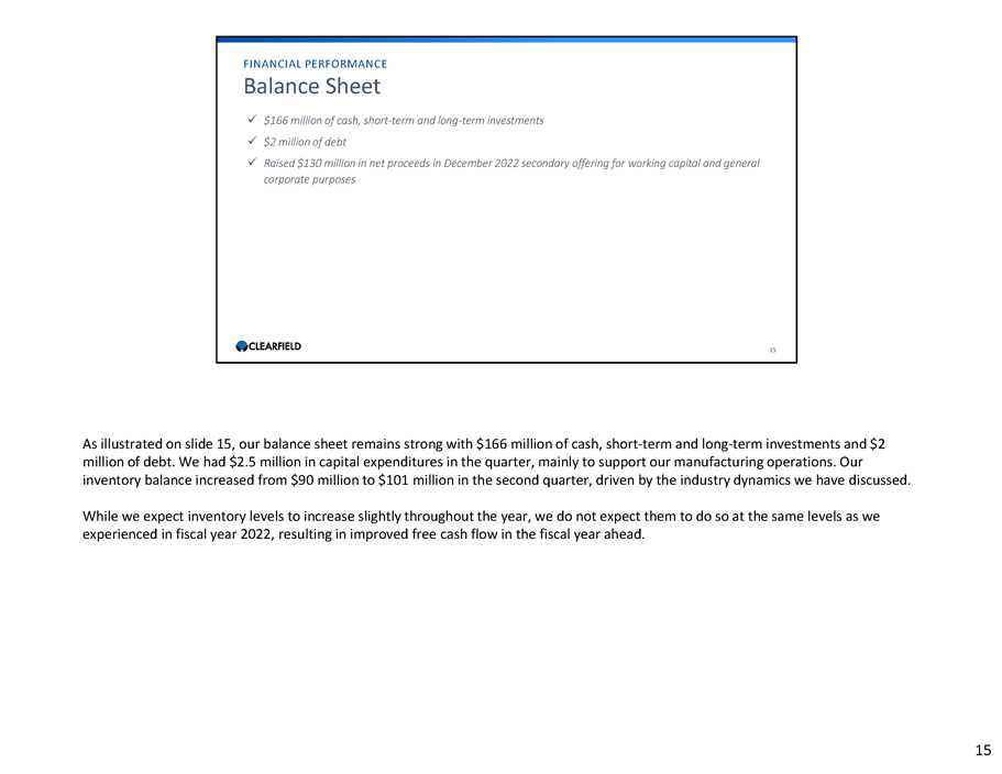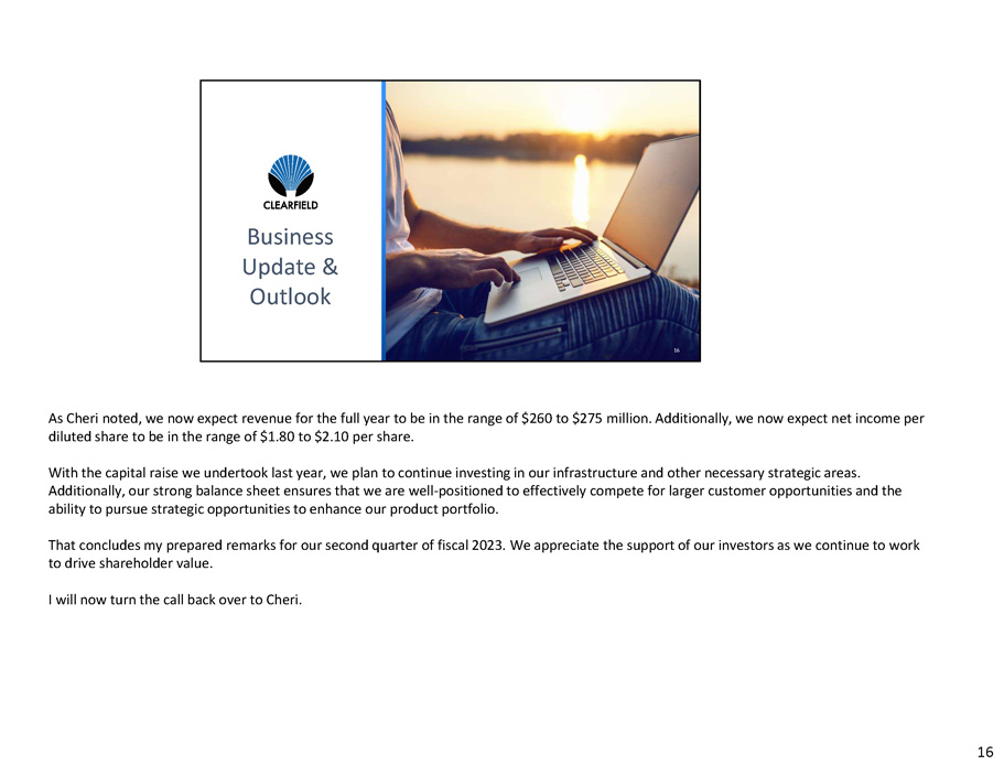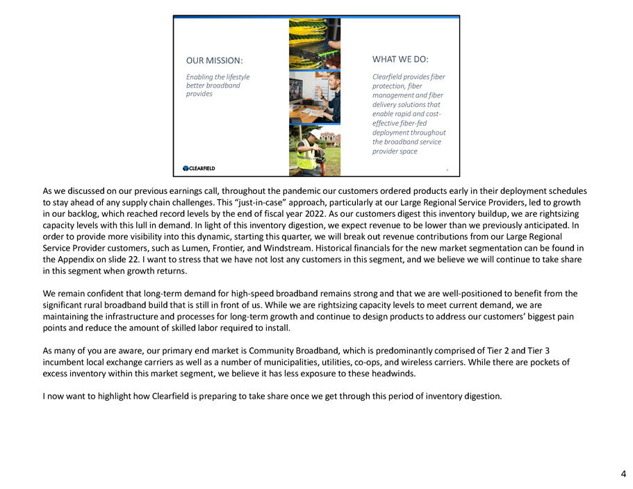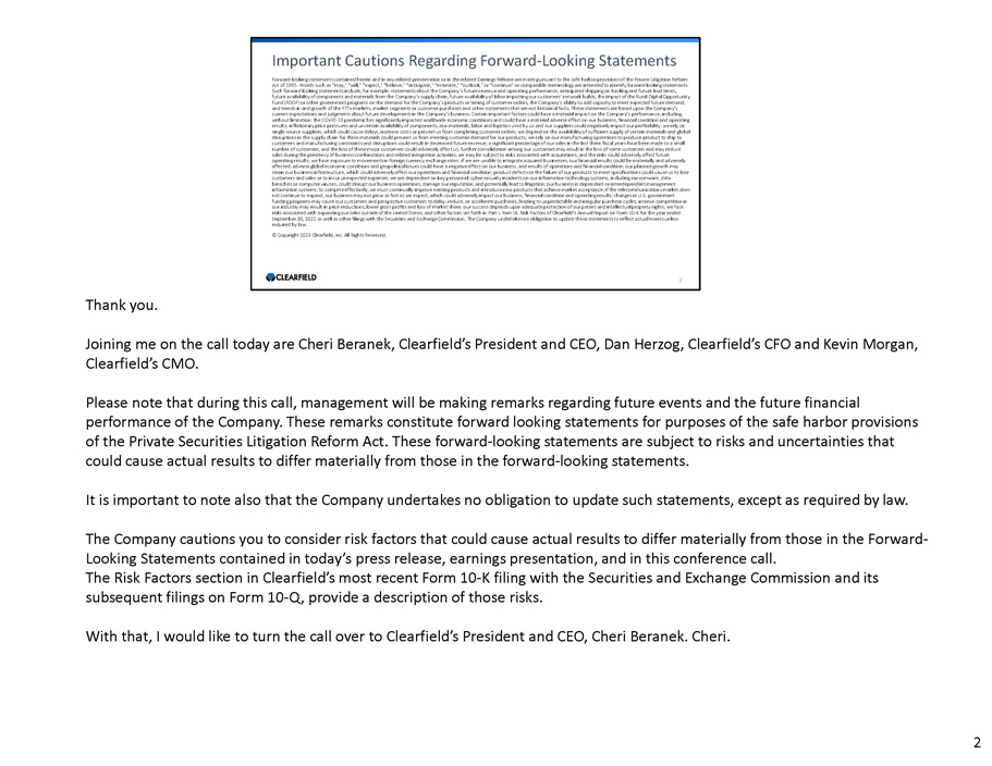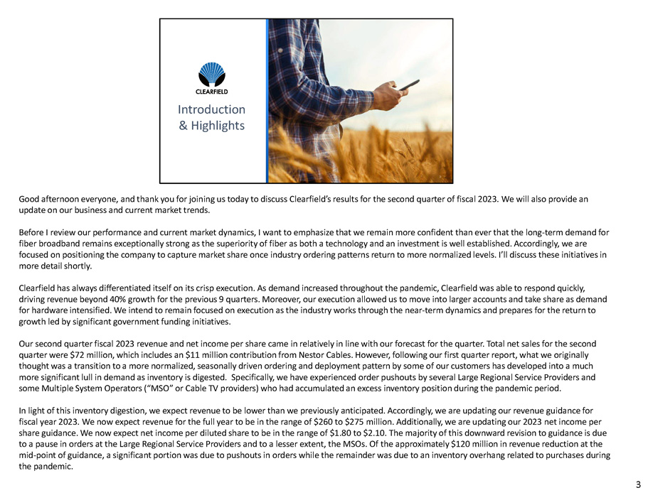 Important Cautions Regarding Forward - Looking Statements Forward - looking statements contained herein and in any related presentation or in the related Earnings Release are made pursuant to the safe harbor provisions of the Private Litigation Reform Act of 1995. Words such as “may,” “will,” “expect,” “believe,” “anticipate,” “estimate,” “outlook,” or “continue” or comparable terminology are intended to identify forward - looking statements. Such forward looking statements include, for example, statements about the Company’s future revenue and operating performance, anticipated shipping on backlog and future lead times, future availability of components and materials from the Company’s supply chain, future availability of labor impacting our customers’ network builds, the impact of the Rural Digital Opportunity Fund (RDOF) or other government programs on the demand for the Company’s products or timing of customer orders, the Company’s ability to add capacity to meet expected future demand, and trends in and growth of the FTTx markets, market segments or customer purchases and other statements that are not historical facts. These statements are based upon the Company's current expectations and judgments about future developments in the Company's business. Certain important factors could have a material impact on the Company's performance, including, without limitation: the COVID - 19 pandemic has significantly impacted worldwide economic conditions and could have a material adverse effect on our business, financial condition and operating results; inflationary price pressures and uncertain availability of components, raw materials, labor and logistics used by us and our suppliers could negatively impact our profitability; we rely on single - source suppliers, which could cause delays, increase costs or prevent us from completing customer orders; we depend on the availability of sufficient supply of certain materials and global disruptions in the supply chain for these materials could prevent us from meeting customer demand for our products; we rely on our manufacturing operations to produce product to ship to customers and manufacturing constraints and disruptions could result in decreased future revenue; a significant percentage of our sales in the last three fiscal years have been made to a small number of customers, and the loss of these major customers could adversely affect us; further consolidation among our customers may result in the loss of some customers and may reduce sales during the pendency of business combinations and related integration activities; we may be subject to risks associated with acquisitions, and the risks could adversely affect future operating results; we have exposure to movements in foreign currency exchange rates; if we are unable to integrate acquired businesses, our financial results could be materially and adversely affected; adverse global economic conditions and geopolitical issues could have a negative effect on our business, and results of operations and financial condition; our planned growth may strain our business infrastructure, which could adversely affect our operations and financial condition; product defects or the failure of our products to meet specifications could cause us to lose customers and sales or to incur unexpected expenses; we are dependent on key personnel; cyber - security incidents on our information technology systems, including ransomware, data breaches or computer viruses, could disrupt our business operations, damage our reputation, and potentially lead to litigation; our business is dependent on interdependent management information systems; to compete effectively, we must continually improve existing products and introduce new products that achieve market acceptance; if the telecommunications market does not continue to expand, our business may not grow as fast as we expect, which could adversely impact our business, financial condition and operating results; changes in U.S. government funding programs may cause our customers and prospective customers to delay, reduce, or accelerate purchases, leading to unpredictable and irregular purchase cycles; intense competition in our industry may result in price reductions, lower gross profits and loss of market share; our success depends upon adequate protection of our patent and intellectual property rights; we face risks associated with expanding our sales outside of the United States; and other factors set forth in Part I, Item IA. Risk Factors of Clearfield's Annual Report on Form 10 - K for the year ended September 30, 2022 as well as other filings with the Securities and Exchange Commission. The Company undertakes no obligation to update these statements to reflect actual events unless required by law. © Copyright 2023 Clearfield, Inc. All Rights Reserved. 2 2 Thank you. Joining me on the call today are Cheri Beranek, Clearfield’s President and CEO, Dan Herzog, Clearfield’s CFO and Kevin Morgan, Clearfield’s CMO. Please note that during this call, management will be making remarks regarding future events and the future financial performance of the Company. These remarks constitute forward looking statements for purposes of the safe harbor provisions of the Private Securities Litigation Reform Act. These forward - looking statements are subject to risks and uncertainties that could cause actual results to differ materially from those in the forward - looking statements. It is important to note also that the Company undertakes no obligation to update such statements, except as required by law. The Company cautions you to consider risk factors that could cause actual results to differ materially from those in the Forward - Looking Statements contained in today’s press release, earnings presentation, and in this conference call. The Risk Factors section in Clearfield’s most recent Form 10 - K filing with the Securities and 