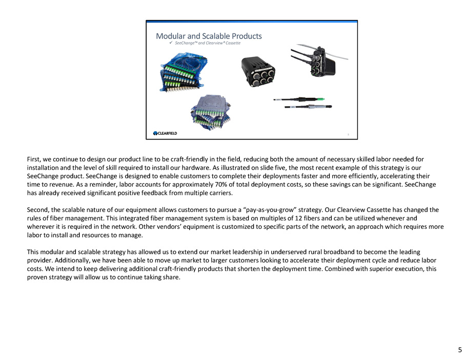 Modular and Scalable Products x SeeChange Ρ and Clearview® Cassette 5 First, we continue to design our product line to be craft - friendly in the field, reducing both the amount of necessary skilled labor needed for installation and the level of skill required to install our hardware. As illustrated on slide five, the most recent example of this strategy is our SeeChange product. SeeChange is designed to enable customers to complete their deployments faster and more efficiently, accelerating their time to revenue. As a reminder, labor accounts for approximately 70% of total deployment costs, so these savings can be significant. SeeChange has already received significant positive feedback from multiple carriers. Second, the scalable nature of our equipment allows customers to pursue a “pay - as - you - grow” strategy. Our Clearview Cassette has changed the rules of fiber management. This integrated fiber management system is based on multiples of 12 fibers and can be utilized whenever and wherever it is required in the network. Other vendors’ equipment is customized to specific parts of the network, an approach which requires more labor to install and resources to manage. This modular and scalable strategy has allowed us to extend our market leadership in underserved rural broadband to become the leading provider. Additionally, we have been able to move up market to larger customers looking to accelerate their deployment cycle and reduce labor costs. We intend to keep delivering additional craft - friendly products that shorten the deployment time. Combined with superior execution, this proven strategy will allow us to continue taking share. 5