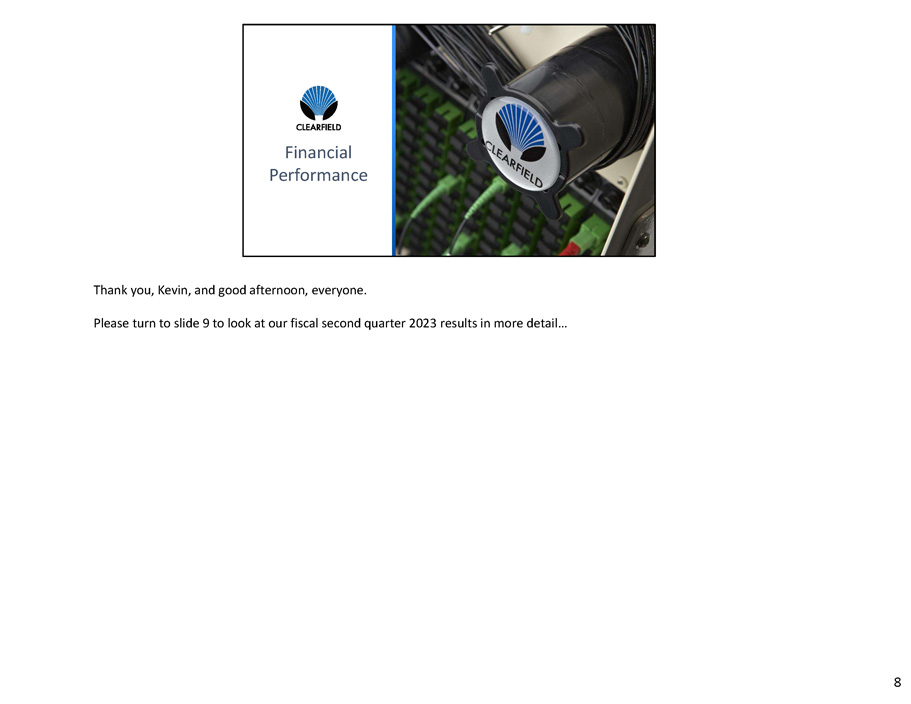 Fiber Deployment shift is occurring in 2023 Source: RVA, February 2023 Millions 7 FTTH Homes Marketed U.S. Cumulative 70 60 50 40 30 20 10 0 FY19 FY20 FY21 FY22 FY23 * FY24 * FY25 * FY26 * Tel - ILEC Tier 1 Other Service Providers * Projected Thank you, Cheri. It’s great to be joining all of you this afternoon. The latest market research forecast from RVA, a leading market research authority in the field of fiber optic telecommunications market research, reflects the industry commitment to fiber expansion. As you can see from the chart, the Tier 1 Independent Local Exchange Carriers, or ILECs, led the initial buildout phase of the Fiber to the Home market during the first 20 years of deployment. However, in 2023 a shift is occurring in the market. According to the data, the other service providers in the market collectively will surpass the cumulative Fiber to the Homes marketed total of the Tier 1 ILECs. Other Service Providers include the Community Broadband and MSO customer segments. The appetite for high - speed broadband communications has never been greater and shows no sign of letting up. This continues to drive fiber deployments deeper into every corner of society and across all market segments. As Cheri mentioned, we believe our work to maintain our world - class lead times and further progress our LEAP strategic plan enhances our position for the long - term demand environment. In 2022 Fiber Provider Survey, published in December, the Fiber Broadband Association estimated a 10 - year annual average run rate of 11.3 million fiber deployments. In 2022 alone, fiber providers passed 7.9 million additional homes, representing a new record for annual deployment. This momentum gives us a powerful foundation for 2023 and the years ahead. We’re positioned within an investment cycle that has yet to reach its peak. We continue to view the gradual disbursement of ARPA and RDOF funds — and the upcoming distribution of BEAD funding – as meaningful, but gradual, industry tailwinds that further expand our market opportunity. Turning back to Clearfield’s fiscal second quarter performance, I’d now like to pass the call over to our CFO, Dan Herzog, who will walk us through our financial results for the fiscal second quarter of 2023. 7