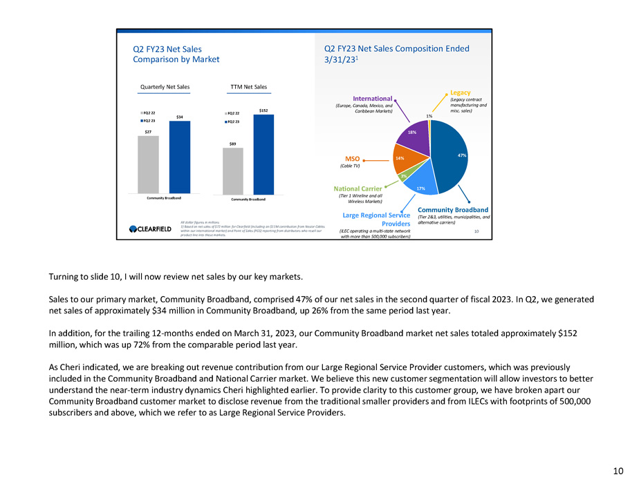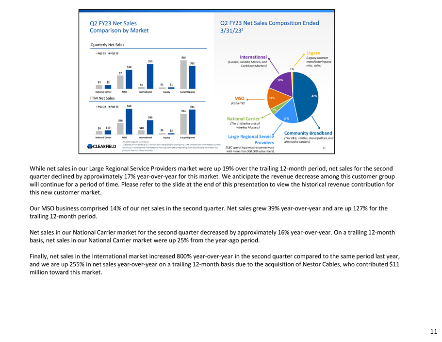 Q2 FY23 Net Sales Comparison by Market All dollar figures in millions 1) Based on net sales of $72 million for Clearfield (including an $11M contribution from Nestor Cables within our international market) and Point of Sales (POS) reporting from distributors who resell our product line into these markets. Q2 FY23 Net Sales Composition Ended 3/31/23 1 Legacy (Legacy contract manufacturing and misc. sales) 47% 17% 3% 14% 18% 1% $89 $152 Community Broadband FQ2 22 FQ2 23 Quarterly Net Sales TTM Net Sales Community Broadband (Tier 2&3, utilities, municipalities, and alternative carriers) MSO (Cable TV) International (Europe, Canada, Mexico, and Caribbean Markets) 10 $27 $34 Community Broadband FQ2 22 FQ2 23 National Carrier (Tier 1 Wireline and all Wireless Markets) Large Regional Service Providers (ILEC operating a multi - state network with more than 500,000 subscribers) Turning to slide 10, I will now review net sales by our key markets. Sales to our primary market, Community Broadband, comprised 47% of our net sales in the second quarter of fiscal 2023. In Q2, we generated net sales of approximately $34 million in Community Broadband, up 26% from the same period last year. In addition, for the trailing 12 - months ended on March 31, 2023, our Community Broadband market net sales totaled approximately $152 million, which was up 72% from the comparable period last year. As Cheri indicated, we are breaking out revenue contribution from our Large Regional Service Provider customers, which was previously included in the Community Broadband and National Carrier market. We believe this new customer segmentation will allow investors to better understand the near - term industry dynamics Cheri highlighted earlier. To provide clarity to this customer group, we have broken apart our Community Broadband customer market to disclose revenue from the traditional smaller providers and from ILECs with footprints of 500,000 subscribers and above, which we refer to as Large Regional Service Providers. 10