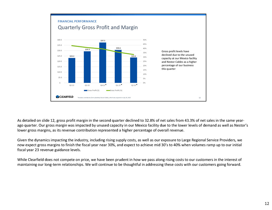 $8 $28 $10 $51 $10 $63 $35 $3 $3 $61 National Carrier FQ2 22 FQ2 23 $7 $1 $15 $2 $2 $10 $13 $1 $1 $12 National Carrier MSO International Legacy Large Regional Q2 FY23 Net Sales Comparison by Market Quarterly Net Sales FQ2 22 FQ2 23 TTM Net Sales MSO International Legacy Large Regional All dollar figures in millions 1) Based on net sales of $72 million for Clearfield (including an $11M contribution from Nestor Cables within our international market) and Point of Sales (POS) reporting from distributors who resell our product line into these markets. Q2 FY23 Net Sales Composition Ended 3/31/23 1 Legacy (Legacy contract manufacturing and misc. sales) 47% 17% 3% 14% 18% 1% MSO (Cable TV) International (Europe, Canada, Mexico, and Caribbean Markets) Community Broadband (Tier 2&3, utilities, municipalities, and alternative carriers) 11 National Carrier (Tier 1 Wireline and all Wireless Markets) Large Regional Service Providers (ILEC operating a multi - state network with more than 500,000 subscribers) While net sales in our Large Regional Service Providers market were up 19 % over the trailing 12 - month period, net sales for the second quarter declined by approximately 17 % year - over - year for this market . We anticipate the revenue decrease among this customer group will continue for a period of time . Please refer to the slide at the end of this presentation to view the historical revenue contribution for this new customer market . Our MSO business comprised 14% of our net sales in the second quarter. Net sales grew 39% year - over - year and are up 127% for the trailing 12 - month period. Net sales in our National Carrier market for the second quarter decreased by approximately 16% year - over - year. On a trailing 12 - month basis, net sales in our National Carrier market were up 25% from the year - ago period. Finally, net sales in the International market increased 800 % year - over - year in the second quarter compared to the same period last year, and we are up 255 % in net sales year - over - year on a trailing 12 - month basis due to the acquisition of Nestor Cables, who contributed $ 11 million toward this market . 11