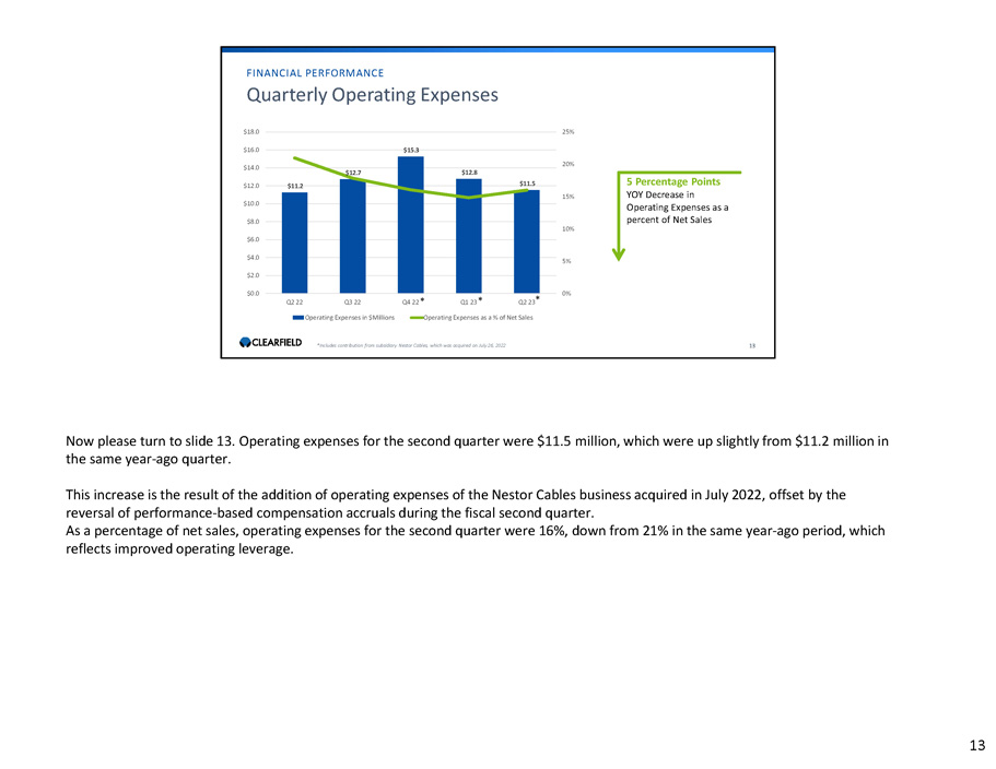 Quarterly Gross Profit and Margin $29.3 $37.5 $30.6 $23.6 0% 5% 10% 30% 35% 40% 45% 50% $ - $5.0 $10.0 $15.0 20% 15% $20.0 25% $25.0 $23.2 $30.0 $35.0 $40.0 FINANCIAL PERFORMANCE 12 Gross profit levels have declined due to the unused capacity at our Mexico facility and Nestor Cables as a higher percentage of our business this quarter *Includes contribution from subsidiary Nestor Cables, which was acquired on July 26, 2022 Q2 22 Q3 22 Q4 22 * Q1 23 * Q2 23 * Gross Profit ($) Gross Profit (%) As detailed on slide 12, gross profit margin in the second quarter declined to 32.8% of net sales from 43.3% of net sales in the same year - ago quarter. Our gross margin was impacted by unused capacity in our Mexico facility due to the lower levels of demand as well as Nestor’s lower gross margins, as its revenue contribution represented a higher percentage of overall revenue. Given the dynamics impacting the industry, including rising supply costs, as well as our exposure to Large Regional Service Providers, we now expect gross margins to finish the fiscal year near 30 % , and expect to achieve mid 30 ’s to 40 % when volumes ramp up to our initial fiscal year 23 revenue guidance levels . While Clearfield does not compete on price, we have been prudent in how we pass along rising costs to our customers in the interest of maintaining our long - term relationships . We will continue to be thoughtful in addressing these costs with our customers going forward . 12