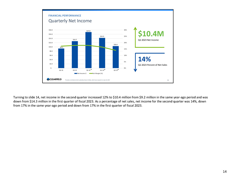 $11.2 $12.7 $12.8 $11.5 0% 5% 10% 15% 20% $2.0 $0.0 $6.0 $4.0 $10.0 $8.0 $12.0 $14.0 $18.0 25% $16.0 $15.3 FINANCIAL PERFORMANCE 5 Percentage Points YOY Decrease in Operating Expenses as a percent of Net Sales 13 Quarterly Operating Expenses Q2 22 Q3 22 Q4 22 * Q1 23 * Q2 23 * Operating Expenses in $Millions Operating Expenses as a % of Net Sales *Includes contribution from subsidiary Nestor Cables, which was acquired on July 26, 2022 Now please turn to slide 13. Operating expenses for the second quarter were $11.5 million, which were up slightly from $11.2 million in the same year - ago quarter. This increase is the result of the addition of operating expenses of the Nestor Cables business acquired in July 2022, offset by the reversal of performance - based compensation accruals during the fiscal second quarter. As a percentage of net sales, operating expenses for the second quarter were 16%, down from 21% in the same year - ago period, which reflects improved operating leverage. 13