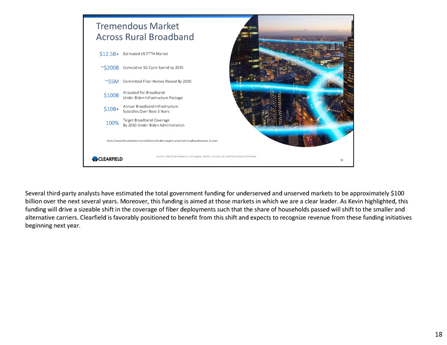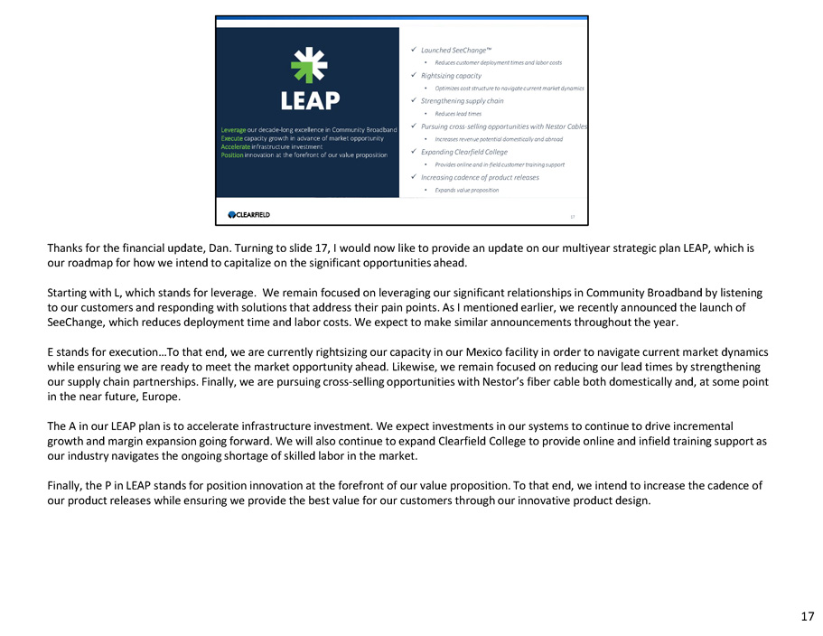 x Launched SeeChange Ρ • Reduces customer deployment times and labor costs x Rightsizing capacity • Optimizes cost structure to navigate current market dynamics x Strengthening supply chain • Reduces lead times x Pursuing cross - selling opportunities with Nestor Cables • Increases revenue potential domestically and abroad x Expanding Clearfield College • Provides online and in - field customer training support x Increasing cadence of product releases • Expands value proposition Leverage our decade - long excellence in Community Broadband Execute capacity growth in advance of market opportunity Accelerate infrastructure investment Position innovation at the forefront of our value proposition 17 17 Thanks for the financial update, Dan. Turning to slide 17, I would now like to provide an update on our multiyear strategic plan LEAP, which is our roadmap for how we intend to capitalize on the significant opportunities ahead. Starting with L, which stands for leverage. We remain focused on leveraging our significant relationships in Community Broadband by listening to our customers and responding with solutions that address their pain points. As I mentioned earlier, we recently announced the launch of SeeChange, which reduces deployment time and labor costs. We expect to make similar announcements throughout the year. E stands for execution…To that end, we are currently rightsizing our capacity in our Mexico facility in order to navigate current market dynamics while ensuring we are ready to meet the market opportunity ahead. Likewise, we remain focused on reducing our lead times by strengthening our supply chain partnerships. Finally, we are pursuing cross - selling opportunities with Nestor’s fiber cable both domestically and, at some point in the near future, Europe. The A in our LEAP plan is to accelerate infrastructure investment. We expect investments in our systems to continue to drive incremental growth and margin expansion going forward. We will also continue to expand Clearfield College to provide online and infield training support as our industry navigates the ongoing shortage of skilled labor in the market. Finally, the P in LEAP stands for position innovation at the forefront of our value proposition. To that end, we intend to increase the cadence of our product releases while ensuring we provide the best value for our customers through our innovative product design.