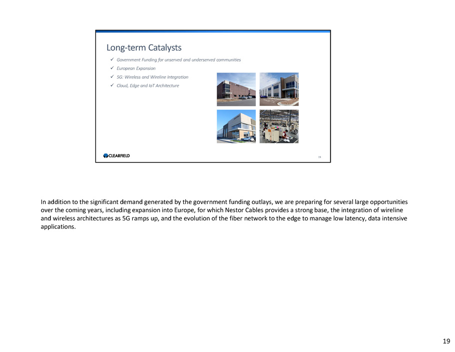 $12.5B+ Estimated US FTTH Market ~$200B Cumulative 5G Cycle Spend by 2035 ~55M Committed Fiber Homes Passed By 2030 Allocated For Broadband Under Biden Infrastructure Package $100B Annual Broadband Infrastructure Subsidies Over Next 3 Years $10B+ Target Broadband Coverage By 2030 Under Biden Administration 100% Tremendous Market Across Rural Broadband Source: Wall Street Research, US Congress, Benton, JD Supra, & Clearfield Company Estimates 18 https:// www.fiercetelecom.com/telecom/biden - targets - universal - broadband - access - 2t - plan Several third - party analysts have estimated the total government funding for underserved and unserved markets to be approximately $100 billion over the next several years. Moreover, this funding is aimed at those markets in which we are a clear leader. As Kevin highlighted, this funding will drive a sizeable shift in the coverage of fiber deployments such that the share of households passed will shift to the smaller and alternative carriers. Clearfield is favorably positioned to benefit from this shift and expects to recognize revenue from these funding initiatives beginning next year. 18