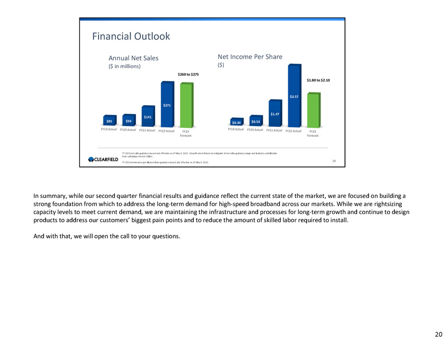 FY19 Actual FY20 Actual FY21 Actual FY22 Actual FY23 Forecast $85 $93 $141 $271 $260 to $275 FY 2023 net sales guidance issued and effective as of May 4, 2023. Growth rate is based on midpoint of net sales guidance range and includes contribution from subsidiary Nestor Cables . FY 2023 net income per diluted share guidance issued and effective as of May 4, 2023. Annual Net Sales ($ in millions) 20 Financial Outlook FY19 Actual FY20 Actual FY21 Actual FY22 Actual FY23 Forecast $0.34 $0.53 $1.47 $3.57 $1.80 to $2.10 Net Income Per Share ($) In summary, while our second quarter financial results and guidance reflect the current state of the market, we are focused on building a strong foundation from which to address the long - term demand for high - speed broadband across our markets. While we are rightsizing capacity levels to meet current demand, we are maintaining the infrastructure and processes for long - term growth and continue to design products to address our customers’ biggest pain points and to reduce the amount of skilled labor required to install. And with that, we will open the call to your questions. 20