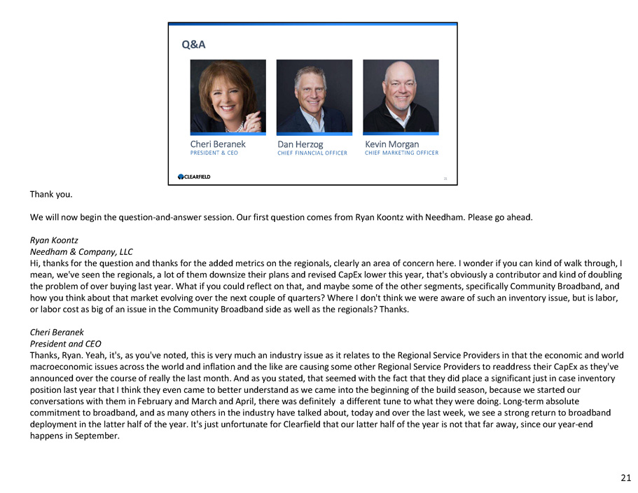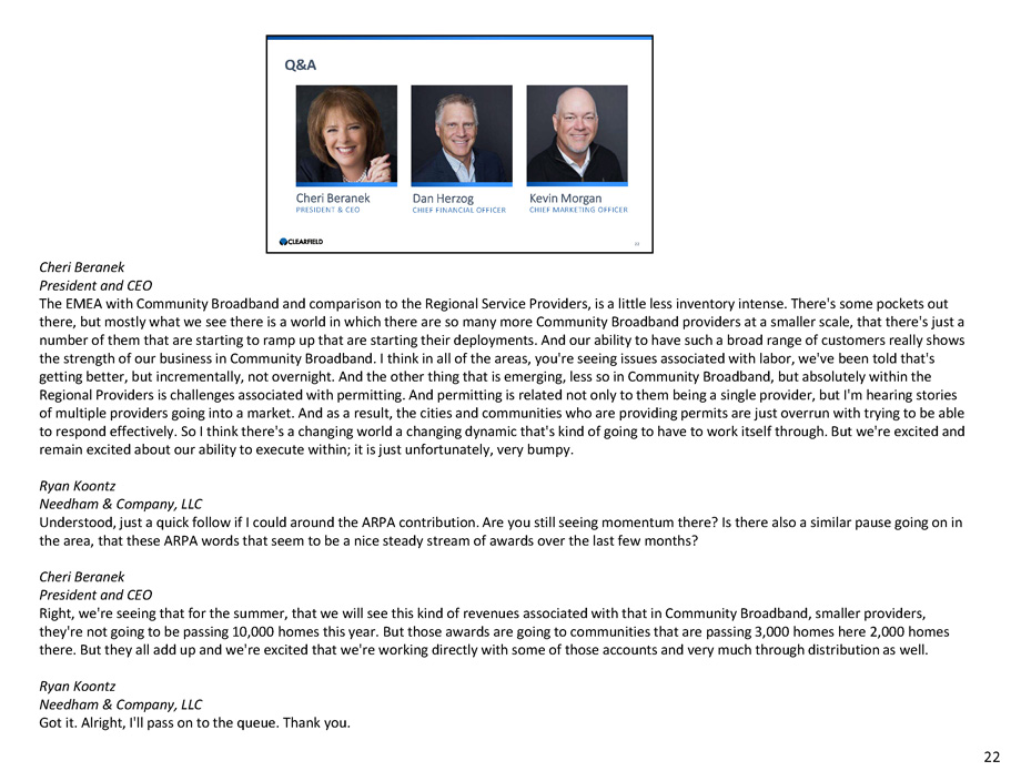 Cheri Beranek PRESIDENT & CEO Dan Herzog CHIEF FINANCIAL OFFICER Q&A 21 Kevin Morgan CHIEF MARKETING OFFICER Thank you. We will now begin the question - and - answer session. Our first question comes from Ryan Koontz with Needham. Please go ahead. Ryan Koontz Needham & Company, LLC Hi, thanks for the question and thanks for the added metrics on the regionals, clearly an area of concern here. I wonder if you can kind of walk through, I mean, we've seen the regionals, a lot of them downsize their plans and revised CapEx lower this year, that's obviously a contributor and kind of doubling the problem of over buying last year. What if you could reflect on that, and maybe some of the other segments, specifically Community Broadband, and how you think about that market evolving over the next couple of quarters? Where I don't think we were aware of such an inventory issue, but is labor, or labor cost as big of an issue in the Community Broadband side as well as the regionals? Thanks. Cheri Beranek President and CEO Thanks, Ryan. Yeah, it's, as you've noted, this is very much an industry issue as it relates to the Regional Service Providers in that the economic and world macroeconomic issues across the world and inflation and the like are causing some other Regional Service Providers to readdress their CapEx as they've announced over the course of really the last month. And as you stated, that seemed with the fact that they did place a significant just in case inventory position last year that I think they even came to better understand as we came into the beginning of the build season, because we started our conversations with them in February and March and April, there was definitely a different tune to what they were doing. Long - term absolute commitment to broadband, and as many others in the industry have talked about, today and over the last week, we see a strong return to broadband deployment in the latter half of the year. It's just unfortunate for Clearfield that our latter half of the year is not that far away, since our year - end happens in September. 21