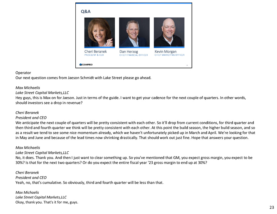 Cheri Beranek PRESIDENT & CEO Dan Herzog CHIEF FINANCIAL OFFICER Q&A 23 Kevin Morgan CHIEF MARKETING OFFICER Operator Our next question comes from Jaeson Schmidt with Lake Street please go ahead. Max Michaelis Lake Street Capital Markets,LLC Hey guys, this is Max on for Jaeson. Just in terms of the guide. I want to get your cadence for the next couple of quarters. In other words, should investors see a drop in revenue? Cheri Beranek President and CEO We anticipate the next couple of quarters will be pretty consistent with each other . So it'll drop from current conditions, for third quarter and then third and fourth quarter we think will be pretty consistent with each other . At this point the build season, the higher build season, and so as a result we tend to see some nice momentum already, which we haven't unfortunately picked up in March and April . We're looking for that in May and June and because of the lead times now shrinking drastically . That should work out just fine . Hope that answers your question . Max Michaelis Lake Street Capital Markets,LLC No, it does. Thank you. And then I just want to clear something up. So you've mentioned that GM, you expect gross margin, you expect to be 30%? Is that for the next two quarters? Or do you expect the entire fiscal year '23 gross margin to end up at 30%? Cheri Beranek President and CEO Yeah, no, that's cumulative. So obviously, third and fourth quarter will be less than that. Max Michaelis Lake Street Capital Markets,LLC Okay, thank you. That's it for me, guys. 23