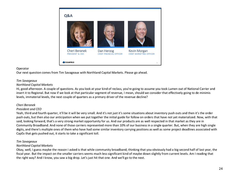 Cheri Beranek PRESIDENT & CEO Dan Herzog CHIEF FINANCIAL OFFICER Q&A 24 Kevin Morgan CHIEF MARKETING OFFICER Operator Our next question comes from Tim Savageaux with Northland Capital Markets. Please go ahead. Tim Savageaux Northland Capital Markets Hi, good afternoon. A couple of questions. As you look at your kind of reclass, you're going to assume you took Lumen out of National Carrier and insert it to Regional. But now if we look at that particular segment of revenue, I mean, should we consider that effectively going to de minimis levels, immaterial levels, the next couple of quarters as a primary driver of the revenue decline? Cheri Beranek President and CEO Yeah, third and fourth quarter, it'll be it will be very small. And it's not just it's some situations about inventory push outs and then it's the order push outs, but then also our anticipation when we put together the initial guide for follow on orders that have not yet materialized. Now, with that said, looking forward, that's a very strong market opportunity for us. And our products are as well respected in that market as they are in Community Broadband. And none of those carriers represented more than 10% of our business in a single quarter. But, when they are high single digits, and there's multiple ones of them who have had some similar inventory carrying positions as well as some project deadlines associated with CapEx that gets pushed out, it starts to take a significant toll. Tim Savageaux Northland Capital Markets Okay, well, I guess maybe the reason I asked is that while community broadband, thinking that you obviously had a big second half of last year, the fiscal year. But the impact on the smaller carriers seems much less significant kind of maybe down slightly from current levels. Am I reading that the right way? And I know, you saw a big drop. Let's just hit that one. And we'll go to the next. 24