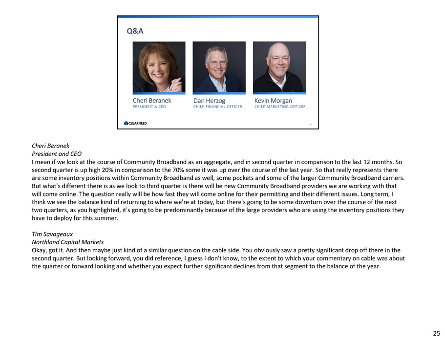 Cheri Beranek PRESIDENT & CEO Dan Herzog CHIEF FINANCIAL OFFICER Q&A 25 Kevin Morgan CHIEF MARKETING OFFICER Cheri Beranek President and CEO I mean if we look at the course of Community Broadband as an aggregate, and in second quarter in comparison to the last 12 months. So second quarter is up high 20% in comparison to the 70% some it was up over the course of the last year. So that really represents there are some inventory positions within Community Broadband as well, some pockets and some of the larger Community Broadband carriers. But what's different there is as we look to third quarter is there will be new Community Broadband providers we are working with that will come online. The question really will be how fast they will come online for their permitting and their different issues. Long term, I think we see the balance kind of returning to where we're at today, but there's going to be some downturn over the course of the next two quarters, as you highlighted, it's going to be predominantly because of the large providers who are using the inventory positions they have to deploy for this summer. Tim Savageaux Northland Capital Markets Okay, got it. And then maybe just kind of a similar question on the cable side. You obviously saw a pretty significant drop off there in the second quarter. But looking forward, you did reference, I guess I don't know, to the extent to which your commentary on cable was about the quarter or forward looking and whether you expect further significant declines from that segment to the balance of the year. 25