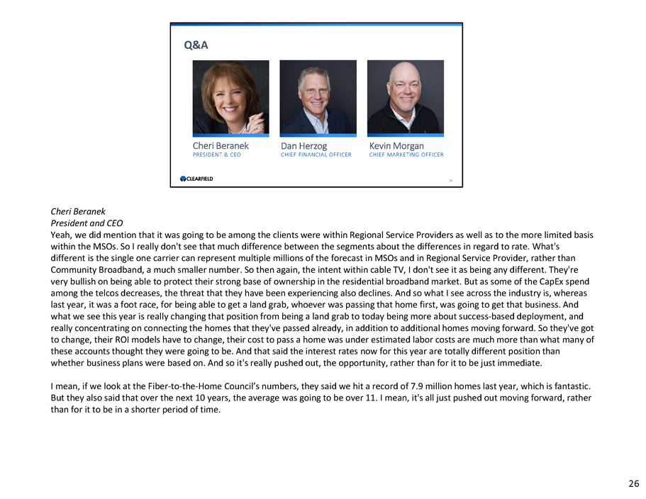 Cheri Beranek PRESIDENT & CEO Dan Herzog CHIEF FINANCIAL OFFICER Q&A 26 Kevin Morgan CHIEF MARKETING OFFICER Cheri Beranek President and CEO Yeah, we did mention that it was going to be among the clients were within Regional Service Providers as well as to the more limited basis within the MSOs. So I really don't see that much difference between the segments about the differences in regard to rate. What's different is the single one carrier can represent multiple millions of the forecast in MSOs and in Regional Service Provider, rather than Community Broadband, a much smaller number. So then again, the intent within cable TV, I don't see it as being any different. They're very bullish on being able to protect their strong base of ownership in the residential broadband market. But as some of the CapEx spend among the telcos decreases, the threat that they have been experiencing also declines. And so what I see across the industry is, whereas last year, it was a foot race, for being able to get a land grab, whoever was passing that home first, was going to get that business. And what we see this year is really changing that position from being a land grab to today being more about success - based deployment, and really concentrating on connecting the homes that they've passed already, in addition to additional homes moving forward. So they've got to change, their ROI models have to change, their cost to pass a home was under estimated labor costs are much more than what many of these accounts thought they were going to be. And that said the interest rates now for this year are totally different position than whether business plans were based on. And so it's really pushed out, the opportunity, rather than for it to be just immediate. I mean, if we look at the Fiber - to - the - Home Council’s numbers, they said we hit a record of 7 . 9 million homes last year, which is fantastic . But they also said that over the next 10 years, the average was going to be over 11 . I mean, it's all just pushed out moving forward, rather than for it to be in a shorter period of time . 26
