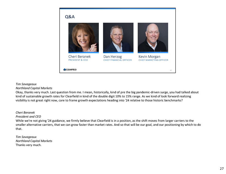 Cheri Beranek PRESIDENT & CEO Dan Herzog CHIEF FINANCIAL OFFICER Q&A 27 Kevin Morgan CHIEF MARKETING OFFICER Tim Savageaux Northland Capital Markets Okay, thanks very much. Last question from me. I mean, historically, kind of pre the big pandemic - driven surge, you had talked about kind of sustainable growth rates for Clearfield in kind of the double digit 10% to 15% range. As we kind of look forward realizing visibility is not great right now, care to frame growth expectations heading into '24 relative to those historic benchmarks? Cheri Beranek President and CEO While we're not giving '24 guidance, we firmly believe that Clearfield is in a position, as the shift moves from larger carriers to the smaller alternative carriers, that we can grow faster than market rates. And so that will be our goal, and our positioning by which to do that. Tim Savageaux Northland Capital Markets Thanks very much. 27
