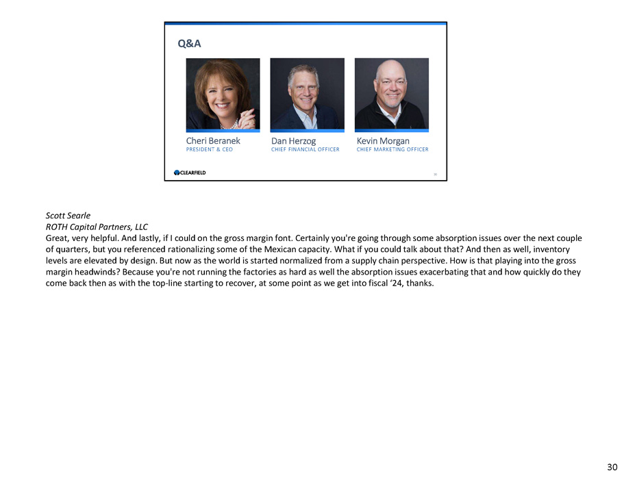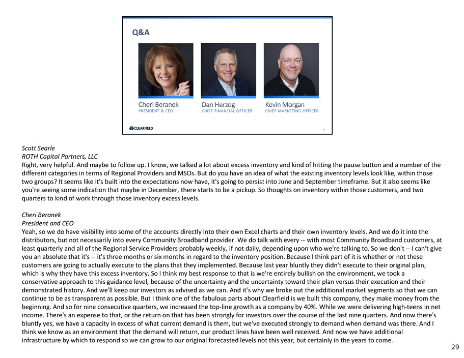 Cheri Beranek PRESIDENT & CEO Dan Herzog CHIEF FINANCIAL OFFICER Q&A 29 Kevin Morgan CHIEF MARKETING OFFICER Scott Searle ROTH Capital Partners, LLC Right, very helpful. And maybe to follow up. I know, we talked a lot about excess inventory and kind of hitting the pause button and a number of the different categories in terms of Regional Providers and MSOs. But do you have an idea of what the existing inventory levels look like, within those two groups? It seems like it's built into the expectations now have, it's going to persist into June and September timeframe. But it also seems like you're seeing some indication that maybe in December, there starts to be a pickup. So thoughts on inventory within those customers, and two quarters to kind of work through those inventory excess levels. Cheri Beranek President and CEO Yeah, so we do have visibility into some of the accounts directly into their own Excel charts and their own inventory levels. And we do it into the distributors, but not necessarily into every Community Broadband provider. We do talk with every -- with most Community Broadband customers, at least quarterly and all of the Regional Service Providers probably weekly, if not daily, depending upon who we're talking to. So we don't -- I can't give you an absolute that it's -- it's three months or six months in regard to the inventory position. Because I think part of it is whether or not these customers are going to actually execute to the plans that they implemented. Because last year bluntly they didn't execute to their original plan, which is why they have this excess inventory. So I think my best response to that is we're entirely bullish on the environment, we took a conservative approach to this guidance level, because of the uncertainty and the uncertainty toward their plan versus their execution and their demonstrated history. And we'll keep our investors as advised as we can. And it's why we broke out the additional market segments so that we can continue to be as transparent as possible. But I think one of the fabulous parts about Clearfield is we built this company, they make money from the beginning. And so for nine consecutive quarters, we increased the top - line growth as a company by 40%. While we were delivering high - teens in net income. There's an expense to that, or the return on that has been strongly for investors over the course of the last nine quarters. And now there's bluntly yes, we have a capacity in excess of what current demand is them, but we've executed strongly to demand when demand was there. And I think we know as an environment that the demand will return, our product lines have been well received. And now we have additional infrastructure by which to respond so we can grow to our original forecasted levels not this year, but certainly in the years to come. 29