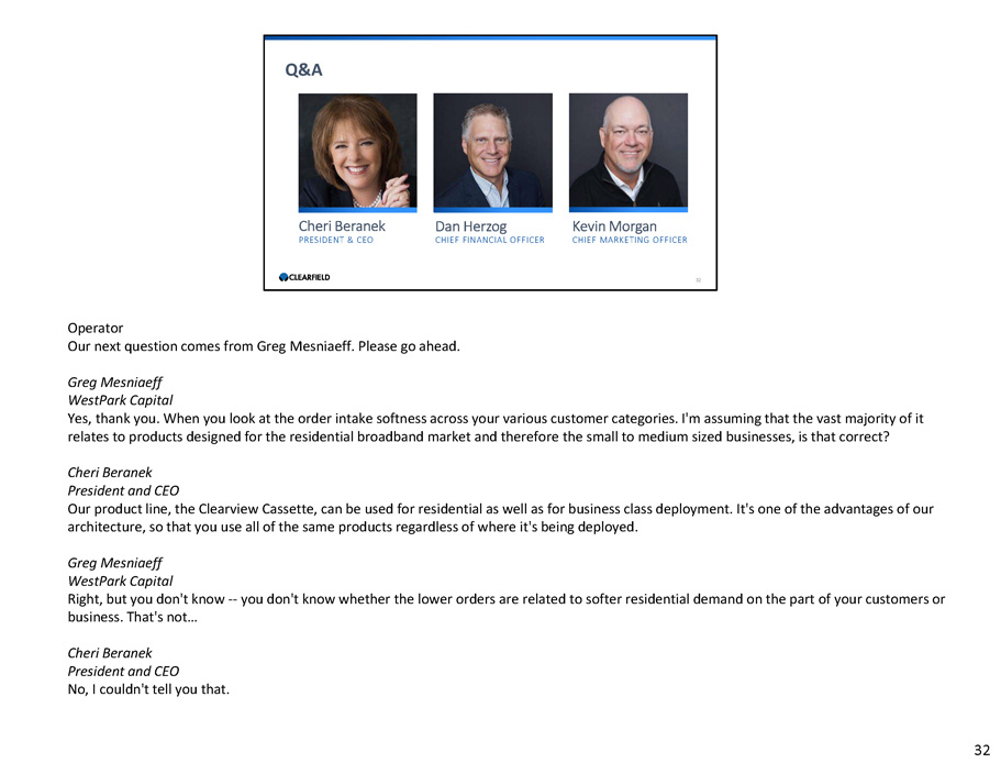 Cheri Beranek PRESIDENT & CEO Dan Herzog CHIEF FINANCIAL OFFICER Q&A 32 Kevin Morgan CHIEF MARKETING OFFICER Operator Our next question comes from Greg Mesniaeff. Please go ahead. Greg Mesniaeff WestPark Capital Yes, thank you. When you look at the order intake softness across your various customer categories. I'm assuming that the vast majority of it relates to products designed for the residential broadband market and therefore the small to medium sized businesses, is that correct? Cheri Beranek President and CEO Our product line, the Clearview Cassette, can be used for residential as well as for business class deployment. It's one of the advantages of our architecture, so that you use all of the same products regardless of where it's being deployed. Greg Mesniaeff WestPark Capital Right, but you don't know -- you don't know whether the lower orders are related to softer residential demand on the part of your customers or business. That's not… Cheri Beranek President and CEO No, I couldn't tell you that. 32