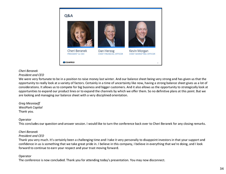 Cheri Beranek PRESIDENT & CEO Dan Herzog CHIEF FINANCIAL OFFICER Q&A 33 Kevin Morgan CHIEF MARKETING OFFICER Greg Mesniaeff WestPark Capital Okay. And second part of the question is as you as your customer base, moves further upstream to the larger carriers, what kind of if any competitive landscape issues are you running into as far as competition? Cheri Beranek President and CEO Well certainly as we move up into the Regional Service Providers, we're coming up to the larger competitors on a more aggressive basis. And last year and the last couple of years during the COVID environment, when our competitors did not have capacity to respond to these providers, it gave us the opportunity to compete for business. And it's important for us during that period of time that we did not simply take orders. I wanted share, I wanted the opportunity for repeat business. And we did a number of trials to facilitate and identify the labor savings, and how we could be long term customers, long term suppliers into that environment. Now larger service providers typically, are going to lower gross profit than Community Broadband. But that will be hidden in our numbers moving forward. Because of the overhead absorption was going to be at a level that it'll hide the increased margin that we would normally see by a straight Community Broadband business. Greg Mesniaeff WestPark Capital Thank you for that. And then one final, any commentary or color on use of proceeds from your raise. 33