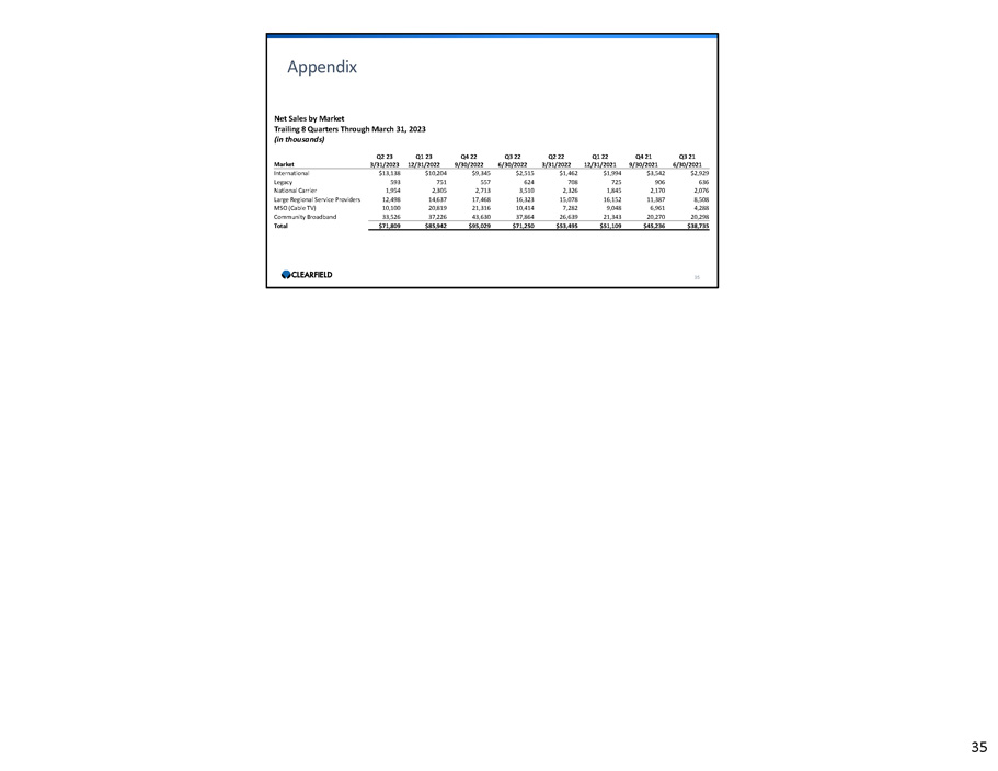 35 Appendix Q4 22 Q3 22 Q2 22 Q1 22 Q4 21 Q3 21 Net Sales by Market Trailing 8 Quarters Through March 31, 2023 (in thousands) Q2 23 Q1 23 Market 3/31/2023 12/31/2022 9/30/2022 6/30/2022 3/31/2022 12/31/2021 9/30/2021 6/30/2021 $2,929 $3,542 $1,994 $1,462 $2,515 $9,345 $10,204 $13,138 International 636 906 725 708 624 557 751 593 Legacy 2,076 2,170 1,845 2,326 3,510 2,713 2,305 1,954 National Carrier 8,508 11,387 16,152 15,078 16,323 17,468 14,637 12,498 Large Regional Service Providers 4,288 6,961 9,048 7,282 10,414 21,316 20,819 10,100 MSO (Cable TV) 33,526 37,226 43,630 37,864 26,639 21,343 20,270 20,298 $71,809 $85,942 $95,029 $71,250 $53,495 $51,109 $45,236 $38,735 Community Broadband Total 35