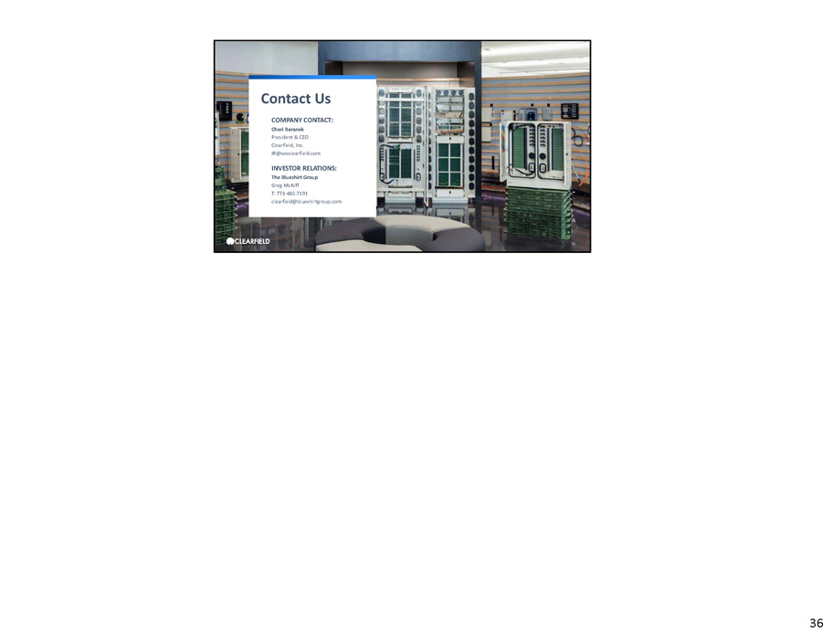 36 Contact Us COMPANY CONTACT: Cheri Beranek President & CEO Clearfield, Inc. IR@seeclearfield.com INVESTOR RELATIONS: The Blueshirt Group Greg McNiff T: 773 - 485 - 7191 clearfield@blueshirtgroup.com 36