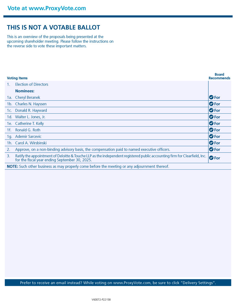 Prefer to receive an email instead? While voting on www.ProxyVote.com, be sure to click “Delivery Settings”. V60072 - P22158 For 1. Election of Directors Nominees: 1a. Cheryl Beranek For Charles N. Hayssen 1b. For Donald R. Hayward 1c. For Walter L. Jones, Jr. 1d. For Catherine T. Kelly 1e. For Ronald G. Roth 1f. For Ademir Sarcevic 1g. For Carol A. Wirsbinski 1h. For 2. Approve, on a non - binding advisory basis, the compensation paid to named executive officers. For 3. Ratify the appointment of Deloitte & Touche LLP as the independent registered public accounting firm for Clearfield, Inc. for the fiscal year ending September 30, 2025. NOTE: Such other business as may properly come before the meeting or any adjournment thereof. Voting Items Board Recommends Vote at www.ProxyVote.com THIS IS NOT A VOTABLE BALLOT This is an overview of the proposals being presented at the upcoming shareholder meeting. Please follow the instructions on the reverse side to vote these important matters.